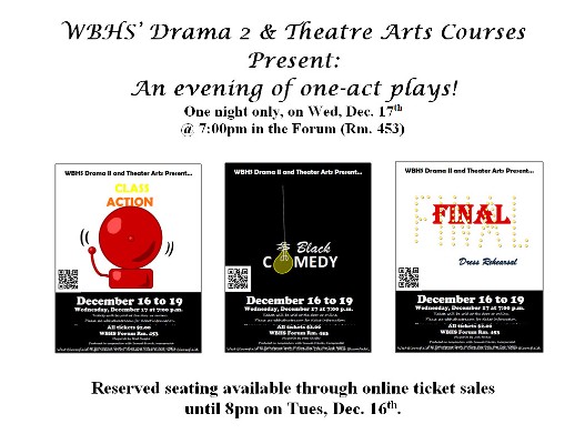Celebrating its second year in existence, WBHS Theatre Arts Program is proud to once again offer students a course-based theatre performance experience. Once again Ms. Marshall's Theatre Arts students and Mr. Greene's Drama 2 students will colaboratively work to rehearse and fully produce two one-act plays. Performances will take place the week before winter break during select class periods. An evening performance for parents will take place at 7:30pm on Wed, Dec. 17th.